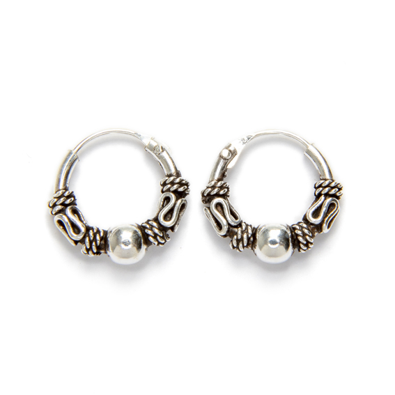 El aro incorpora una bola central de plata acompañada de pequeños detalles ornamentales, un estilo característico de la joyería Bali que aporta textura y personalidad al diseño manteniendo una estética equilibrada y elegante.