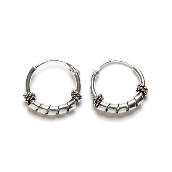 El aro incorpora pequeñas cuentas tubulares de plata con separadores ornamentales, un detalle característico del estilo Bali que aporta textura y personalidad al diseño sin perder su estética sencilla y elegante.