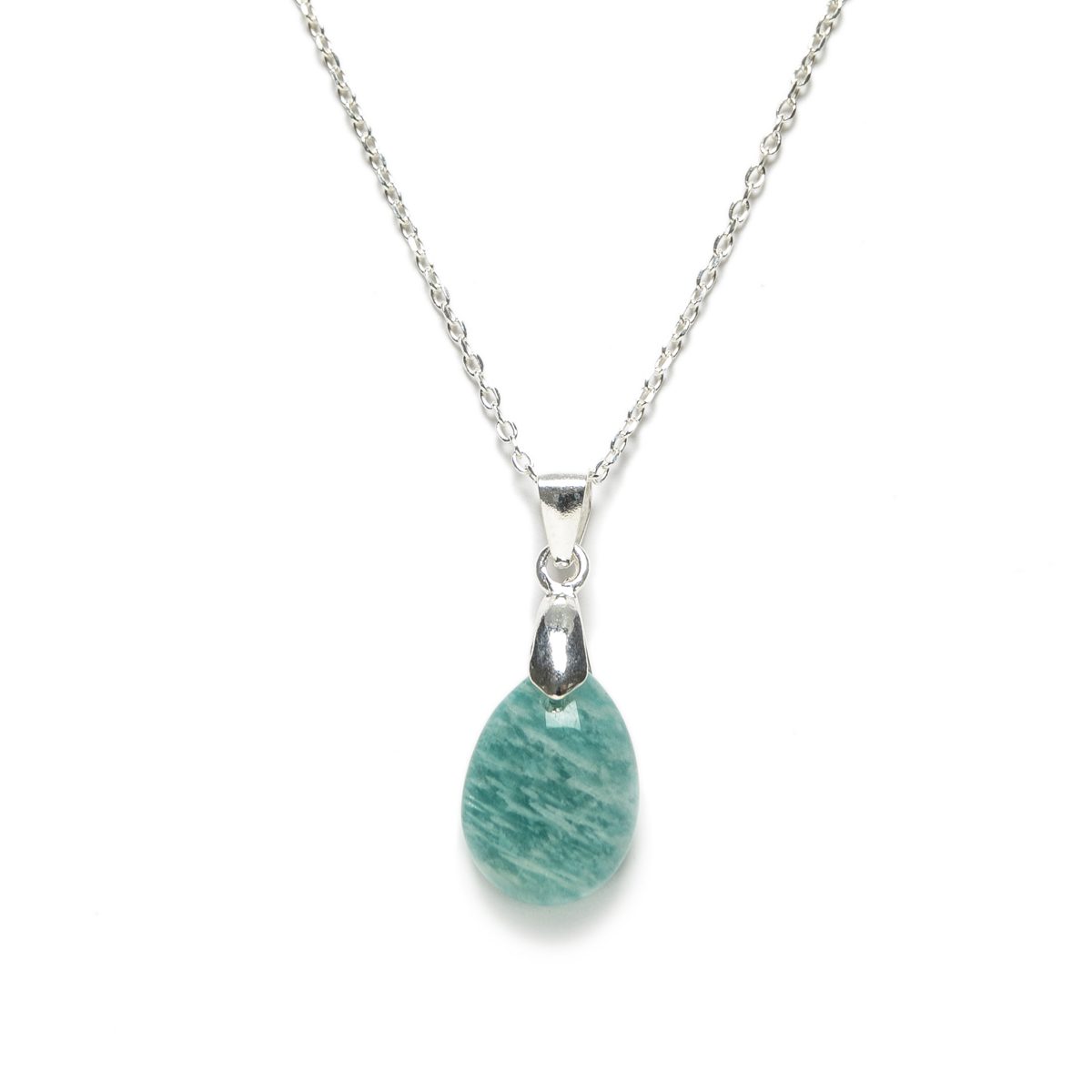 El colgante presenta una amazonita natural pulida en forma de lágrima, con su característico tono verde azulado y sus suaves vetas naturales que hacen que cada pieza sea única. Estas variaciones propias del mineral aportan autenticidad y un encanto especial a la joya.