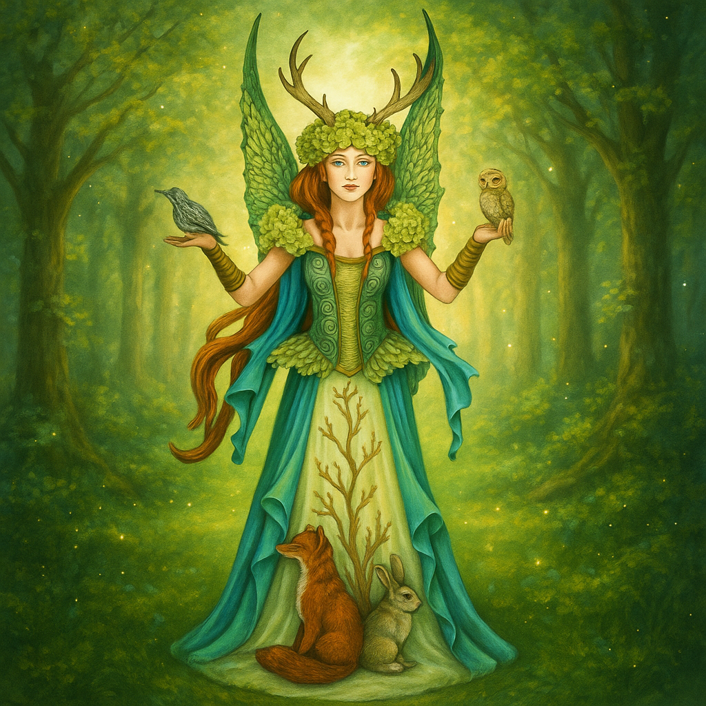 La obra muestra a un hada majestuosa, vestida en tonos verdes, con corona floral y astas, mientras sostiene en equilibrio a un cuervo y una lechuza. En la falda se reflejan un zorro y un conejo, símbolos de la vida salvaje que protege.