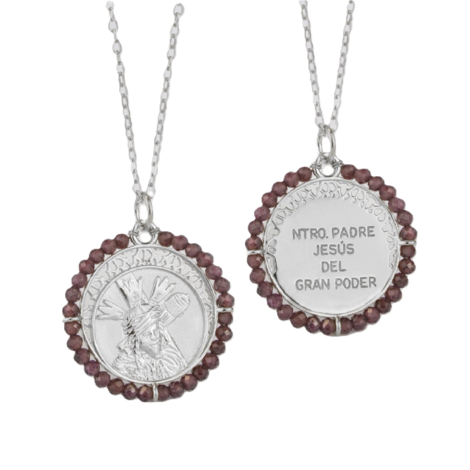 Solemne gargantilla en Plata de Ley 925 con medalla de Nuestro Padre Jesús del Gran Poder, una de las devociones más veneradas, símbolo de compasión, misericordia y amor divino que derriba todo obstáculo. La pieza se embellece con una piedra granate facetada de intenso tono rojo, que realza el diseño y representa fuerza y entrega.