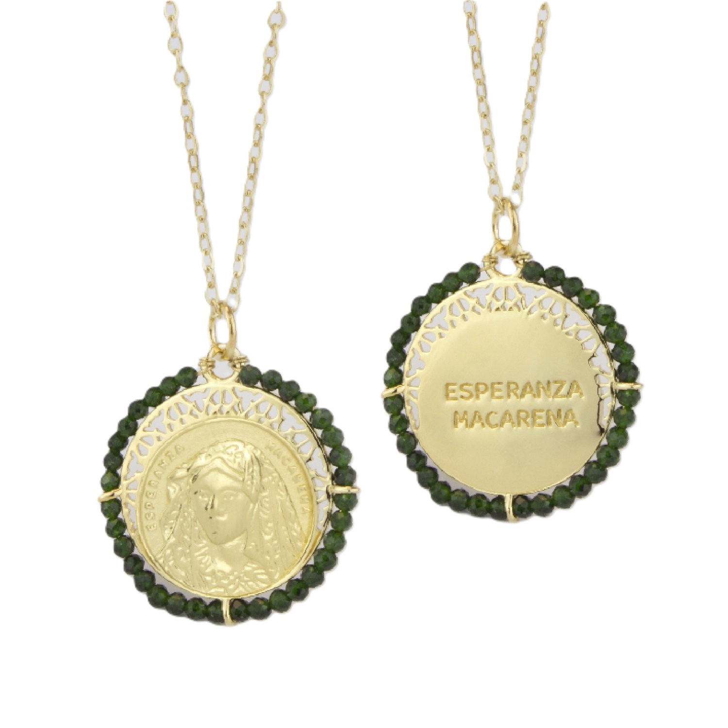 Elegante gargantilla en Plata de Ley 925 chapada en oro, con medalla de la Virgen de la Esperanza Macarena, emblema de fortaleza, protección y consuelo en los momentos difíciles. El diseño se realza con una piedra verde esmeralda facetada, símbolo de fe y esperanza, que aporta un brillo especial a la pieza.
