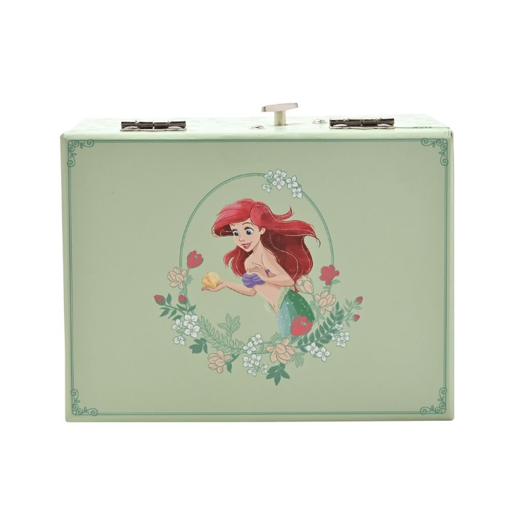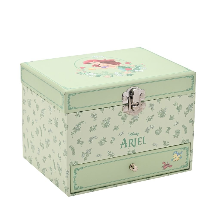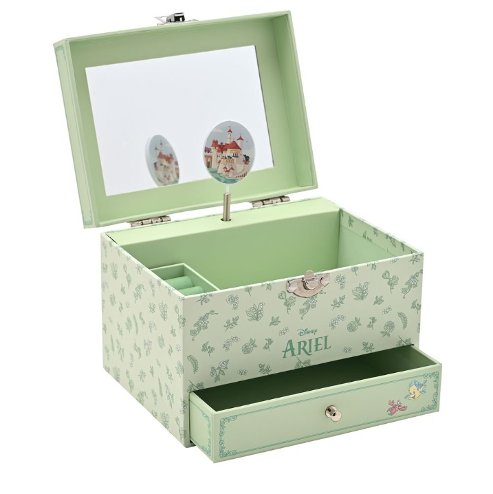 Su exterior en tonos verdes con ilustraciones marinas y la imagen de Ariel lo convierten en una pieza única y delicada. Al abrirlo, encontrarás un espejo interior, compartimento principal con anillero y un práctico cajón inferior para guardar todas tus joyas y accesorios.