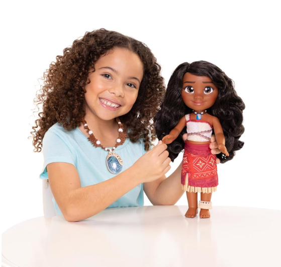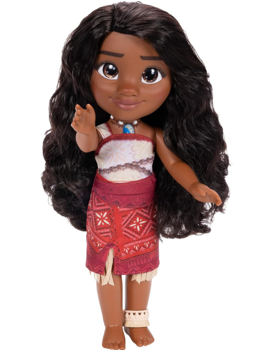 Su melena larga y oscura está lista para peinar y jugar, mientras que su vestido inspirado en su atuendo tradicional refleja su espíritu valiente y decidido. Sus ojos grandes y expresivos capturan toda la energía y determinación de Vaiana, dando vida a cada historia que inventes.