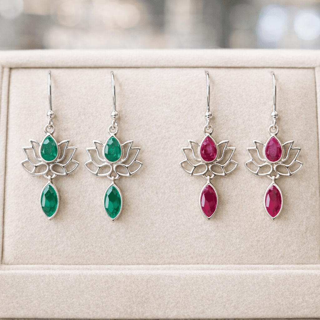 Cada pendiente combina la belleza de la plata con dos piedras naturales facetadas, que aportan color, brillo y personalidad a la pieza. El diseño presenta una piedra en forma de lágrima en la parte superior integrada en la flor de loto y una segunda piedra colgante que aporta movimiento y elegancia al conjunto.