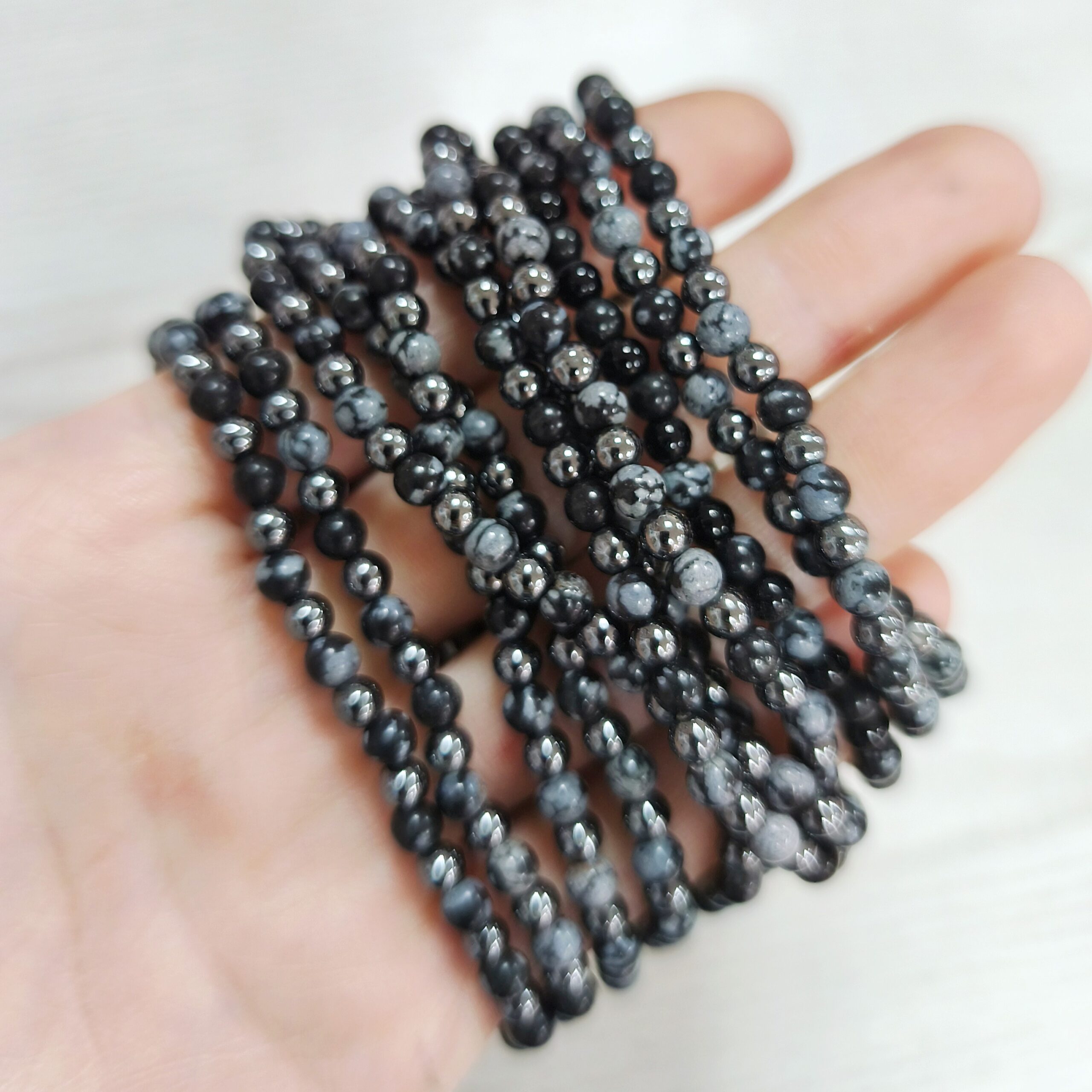 Pulsera de minerales naturales compuesta por hematita y obsidiana nevada en bolitas de 4 mm, una combinación poderosa asociada al coraje, la protección y el equilibrio emocional.
