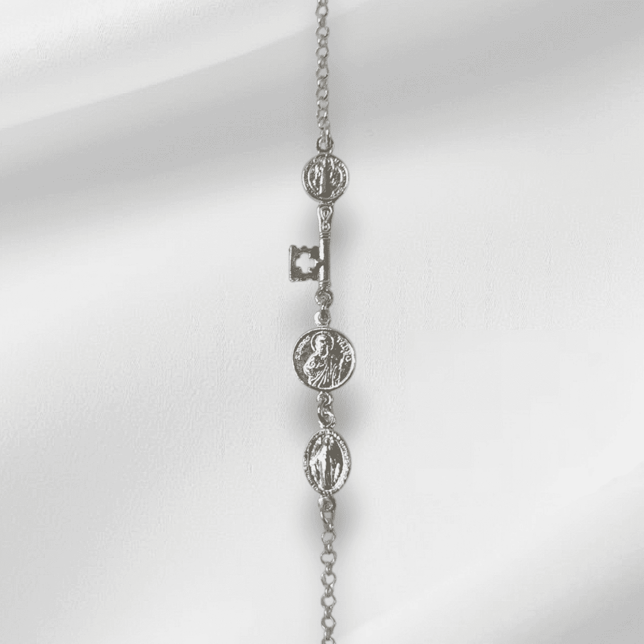 Pulsera de plata con San Judas, llave de San Benito y Medalla Milagrosa
