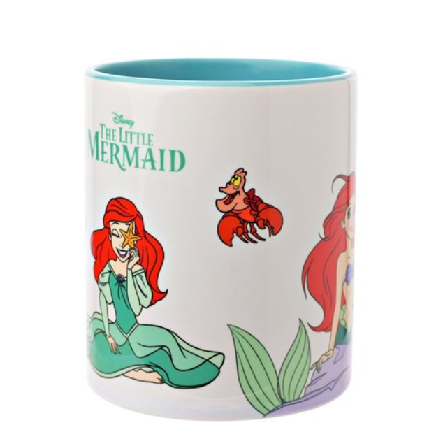 El diseño exterior muestra a Ariel en distintas poses junto a sus inseparables amigos Sebastián 🦀 y Flounder 🐠, creando una pieza llena de color y alegría. Además, el interior en verde agua aporta un detalle fresco que recuerda al fondo del mar.