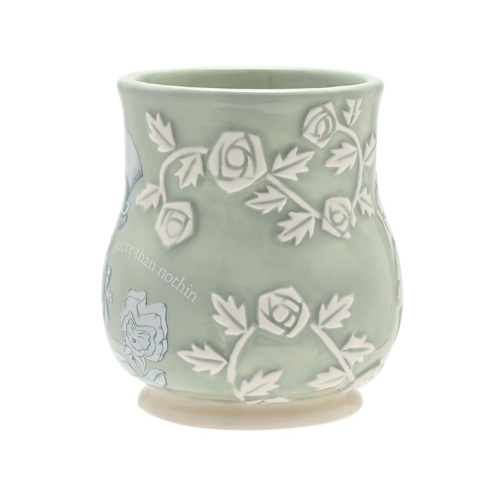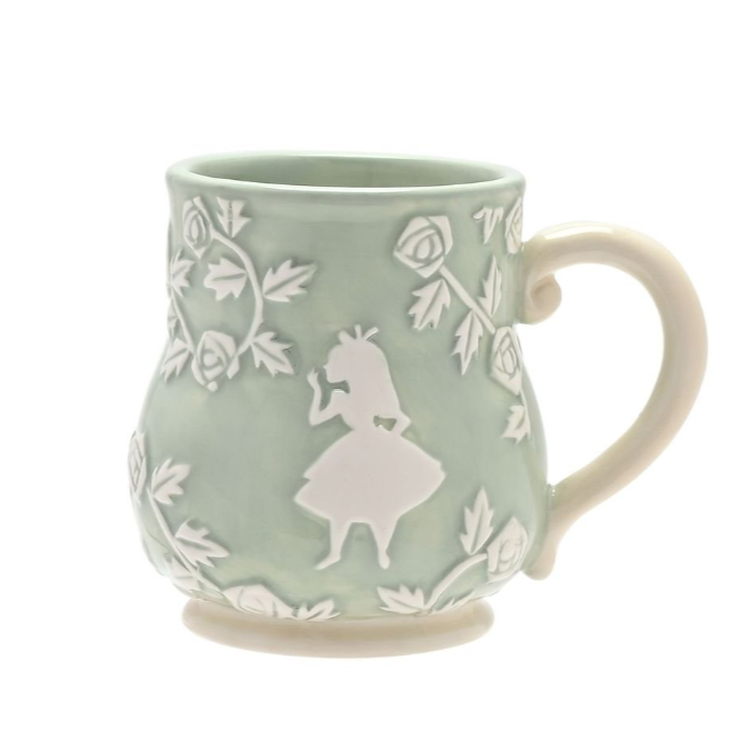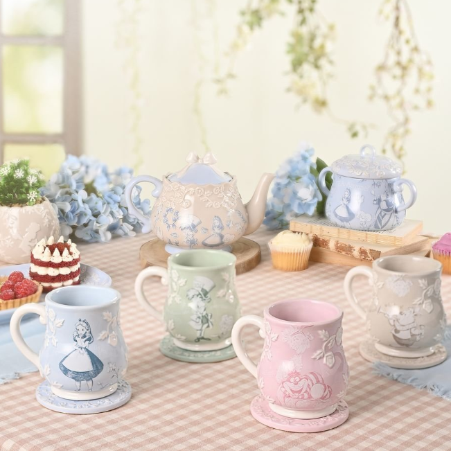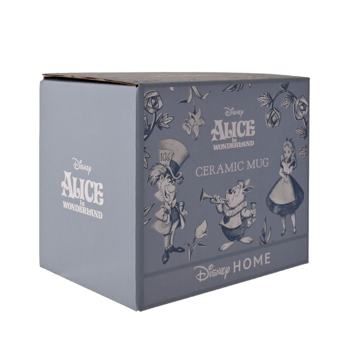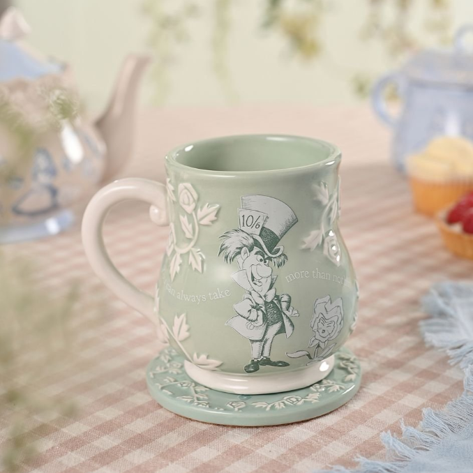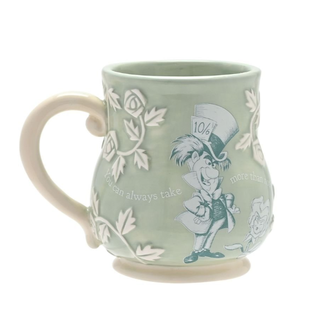 Elaborada en cerámica esmaltada, su diseño presenta un delicado relieve floral acompañado de frases icónicas del personaje (“You can always take more than nothing”), junto al divertido retrato del Sombrerero Loco y la simpática Liebre de Marzo.